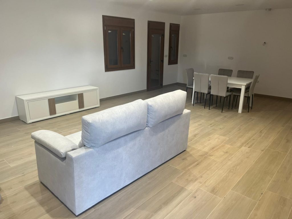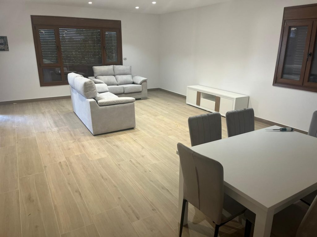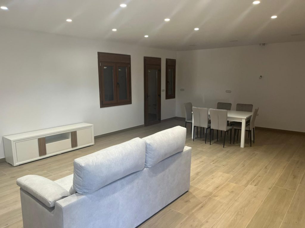 El interior de la casa destaca por un amplio y luminoso salón-comedor de concepto abierto, diseñado para la comodidad y el disfrute. El suelo de gres porcelánico imitación madera clara aporta calidez y una sensación de amplitud.