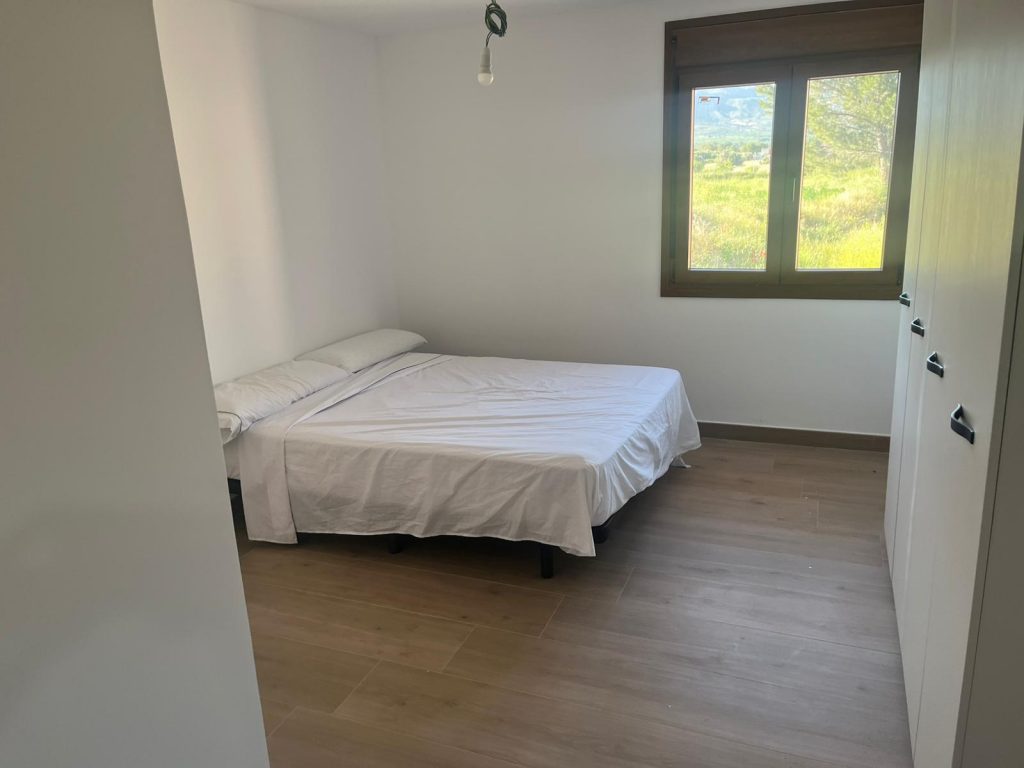 El dormitorio principal es un espacio acogedor y luminoso, ideal para el descanso. Cuenta con una cama de matrimonio, vestida con sábanas blancas que aportan una sensación de frescura y limpieza.